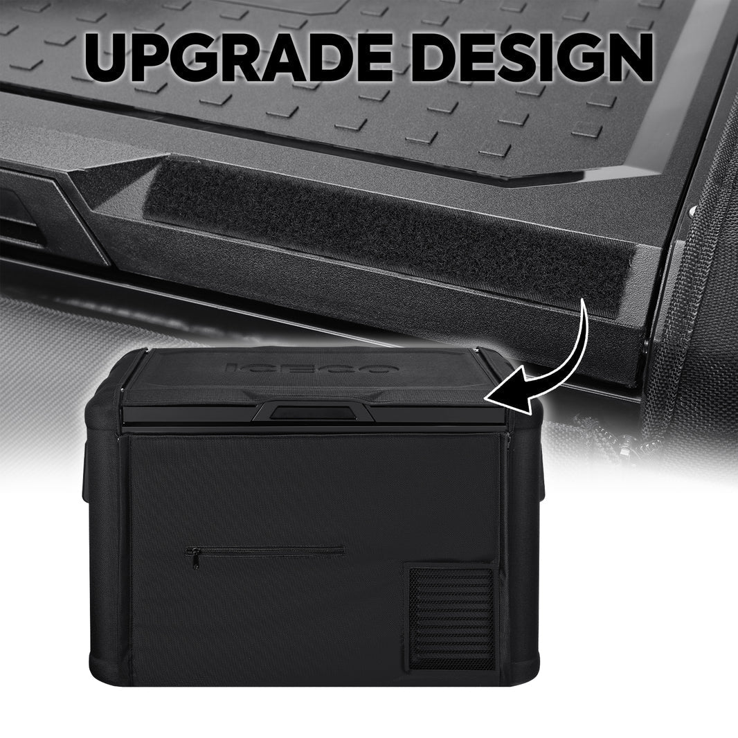 The ICECO Protective Cover for VL45 Pro Single Zone offers enhanced protection and improved efficiency for your portable freezer. Designed as a two-piece cover, it provides a better fit and comprehensive coverage to keep your fridge safe during use. The thoughtful design integrates the cover lid with the refrigerator lid using loops, allowing you to open the fridge directly without needing to remove the cover, making access more convenient and effortless.
